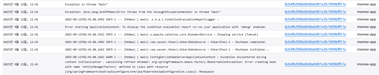 2025-09-12T02:41:06.164Z WARN 1 --- [MoNew] [ main] ConfigServletWebServerApplicationContext : Exception encountered during context initialization - cancelling refresh attempt: org.springframework.beans.factory.BeanCreationException: Error creating bean with name 'entityManagerFactory' defined in class path resource [org/springframework/boot/autoconfigure/orm/jpa/HibernateJpaConfiguration.class]: Metaspace