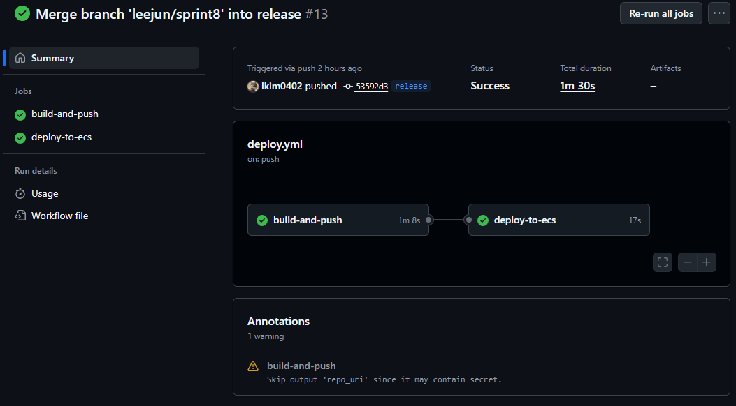 심화로 CICD 배포 파이프라인을 구현하는 과제를 진행했었다.test.ymlname: CI Workflowon: # push: # branches: [ "main", "leejun/sprint8" ] pull_request: branches: [ "main" ]jobs: build: runs-on: ubuntu-latest steps: - uses: actions/checkout@v3 - name: JDK 17 설정 uses: actions/setup-java@v3 with: java-version: 17 distribution: 'temurin' - name: 테스트 권한 ru..